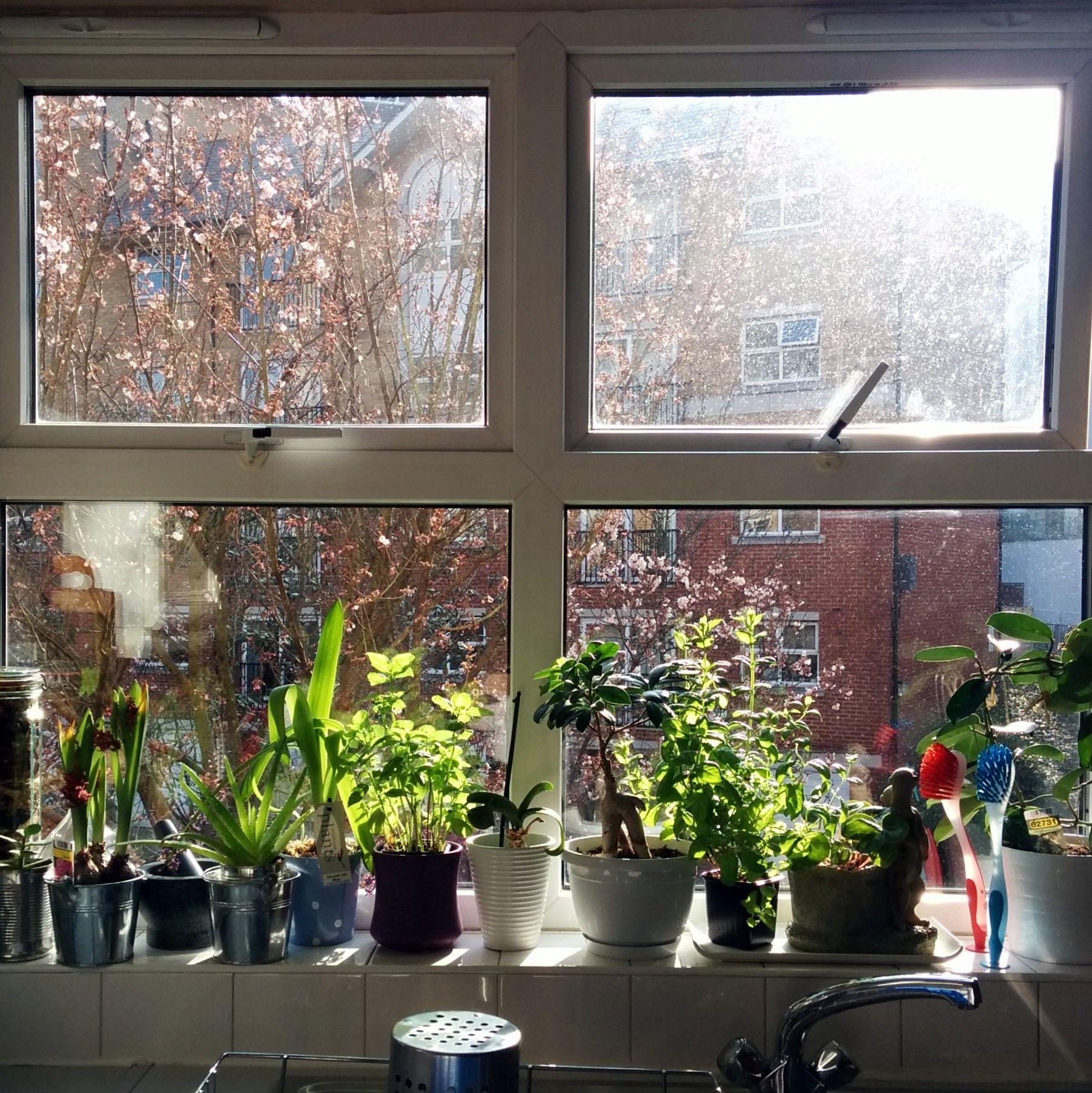 Fuori dalla finestra cielo grigio (su), 17 gradi e vento ale 9 del mattino.